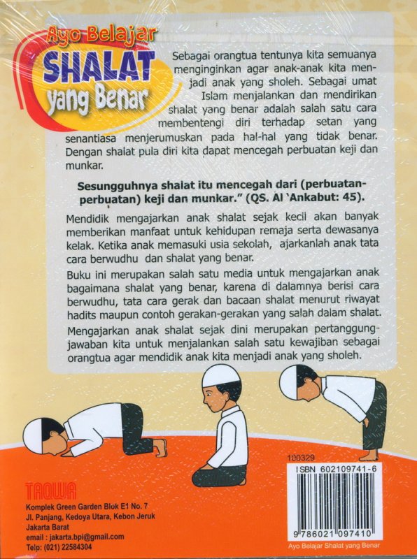 Buku ini merupakan salah satu media untuk mengajarkan anak bagaimana shalat yang benar, karena di dalamnya berisi cara berwudhu, tata cara gerak dan bacaan shalat menurut riwayat hadits maupun contoh gerakan-gerakan yang salah dalam shalat. Mengajarkan anak shalat sejak dini merupakan pertanggung-jawaban kita untuk menjalankan salah satu kewajiban sebagai orangtua agar mendidik anak kita menjadi anak yang sholeh.