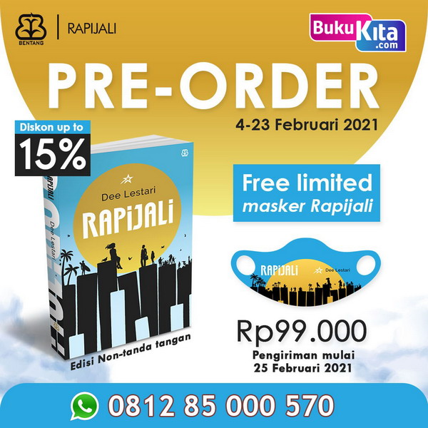 ✅ Rapijali ditulis oleh Dee Lestari, penulis Indonesia yang telah banyak dikenal lewat karya-karyanya seperti Supernova, Madre, Filosofi Kopi, Rectoverso, Perahu Kertas, Aroma Karsa, Di Balik Tirai Aroma Karsa, dan Rantai Tak Putus (non fiksi). Karya-karyanya itu diterima dengan baik di kalangan masyarakat pembaca. 😍☺️