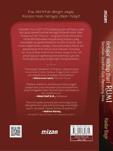 Jalaluddin Rumi (1207-1273) adalah penyair sufi Persia, salah satu yang mewakili puncak tertinggi khazanah sastra Islam. Orang suci dari Timur iniyang sejak bocah diramalkan oleh Fariduddin Attar akan menjadi orang masyhur yang akan menyalakan api gairah ketuhanan ke seluruh duniaoleh Unesco digambarkan sebagai seorang humanis, filosof, dan penyair besar milik semua umat manusia. Namanya memang melekat abadi di hati banyak warga dunia, tak peduali apa pun agamanya, karena kemilau syair dan kandungannya yang menghunjam relung kesadaran.