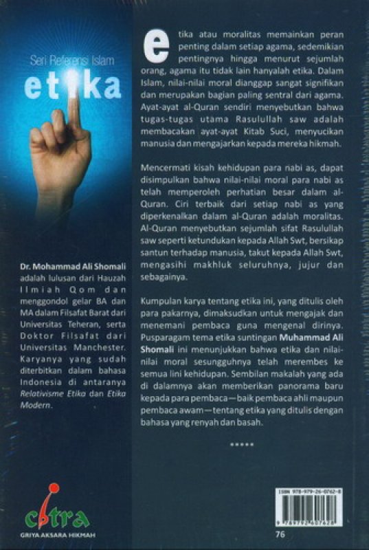 Kumpulan karya tentang etika ini, yang ditulis oleh para pakarnya, dimaksudkan untuk mengajak dan menemani pembaca guna mengenal dirinya. Pusparagam tema etika suntingan Muhammad Ali Shomali ini menunjukkan bahwa etika dan nilai- nilai moral sesungguhnya telah merembes ke semua lini kehidupan. Sembilan makalah yang ada di dalamnya akan memberikan panorama baru kepada para pembacabaik pembaca ahli maupun pembaca awamtentang etika yang ditulis dengan bahasa yang renyah dan basah.