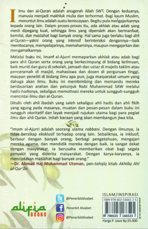 Melalui buiku ini, Imani al-Ajurri memaparkan akhlak atau adab bagi para ahli Quran serta orang yang berkecimpung di bidang keilmuan, baik murid dan guru di sekolah, jamaah dan ustaz di majelis taklim atau penceramah di masjid, mahasiswa dan dosen di perguruan tinggi, maupun peneliti di bidang ilmu apa pun, juga masyarakat umum yang dahaga akan ilmu. Buku ini membimbing dan memandu mereka berdasarkan arahan dan petunjuk Nabi Muhammad SAW melalui hadis-hadisnya, sekaligus memotivasi mereka untuk sungguh-sungguh mencintai ilmu dan al-Quran.