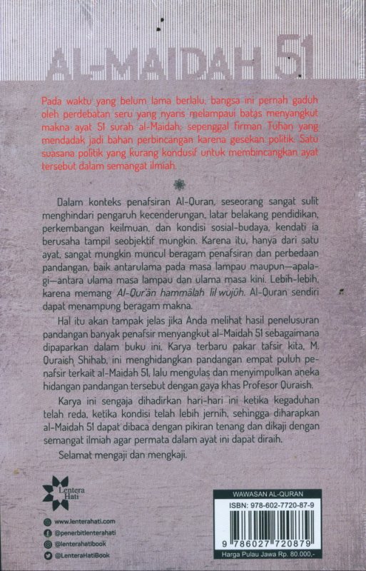 Hal itu akan tampak jelas jika Anda melihat hasil penelusuran pandangan banyak penafsir menyangkut al-Maidah 51 sebagaimana dipaparkan dalam buku ini. Karya terbaru pakar tafsir kita, M. Qurai$h Shihab, ini menghidangkan pandangan empat puluh penafsir terkait al-Maidah 51. lalu mengulas dan menyimpulkan aneka hidangan pandangan tersebut dengan gaya khas Profesor Ouraish.