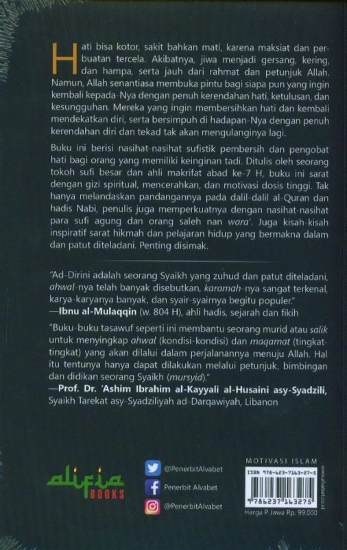 kesungguhan. Mereka yang ingin membersihkan hati dan kembali mendekatkan diri, serta bersimpuh di hadapan Nya dengan penuh kerendahan diri dan tekad tak akan mengulanginya lagi. Buku ini berisi nasihat nasihat sufistik pembersih dan pengobat hati bagi orang yang memiliki keinginan tadi. Ditulis oleh seorang tokoh sufi besar dan ahli makrifat abad ke 7 H, buku ini sarat dengan gizi spiritual, mencerahkan, dan motivasi dosis tinggi. Tak hanya melandaskan pandangannya pada dalil dalil al Quran dan hadis Nabi, penulis juga memperkuatnya dengan nasihat nasihat