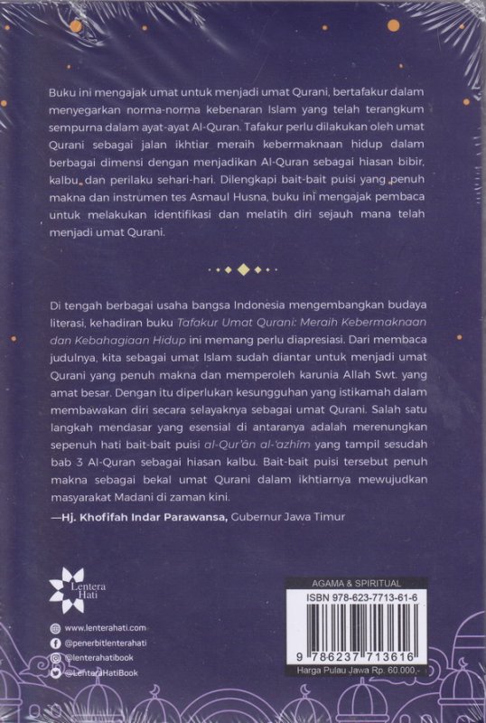 Buku ini mengajak umat untuk menjadi umat qurani,bertafakur dalam menyegarkan norma-norma islam yang telah terangkum sempurna dalam ayat-ayat Al-Quran.Tafakur perlu dilakukan oleh umat Qurani sebagai jalan ikhtiar meraih kebermaknaan hidup dalam berbagai demensi dengan menjadikan Al-Quran sebagai hiasan bibir,kalbu dan perilaku sehari-hari.Dilengkapi bait-bait puisi yang penuh makna dan instrumen tes Asmaul Husna,buku ini mengajak pembaca untuk melakukan identifikasi dan melatih diri sejauh mana telah menjadi umat Qurani.
