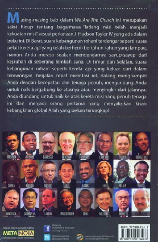 Masing-masing bab dalam We Are The Church ini merupakan saksi hidup tentang bagaimana ladang misi telah menjadi kekuatan misi, sesuai perkataan J. Hudson Taylor IV yang ada dalam buku ini. Di Barat, suara kebangunan rohani terdengar seperti suara peluit kereta api yang telah berhenti bertahun-tahun yang lampau, namun Anda merasa seakan mendengarnya sayup-sayup dari kejauhan di seberang lembah sana. Di Timur dan Selatan, suara kebangunan rohani seperti kereta api yang keluar dari dalam terowongan, berjalan cepat melintasi rel, datang menghampiri Anda dengan kecepatan dan tenaga penuh, mengundang Anda untuk naik bergabung ke atasnya atau menyingkir dari jalannya. Anda diundang untuk naik ke atas kereta misi yang penuh tenaga ini dan menjadi orang pertama yang menyaksikan kisah kebangkitan global Allah yang belum terungkap!