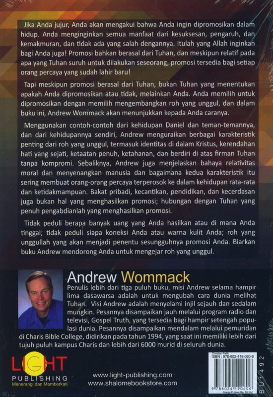 Tidak peduli berapa banyak uang yang Anda hasilkan atau di mana Anda tinggal; tidak peduli siapa koneksi Anda atau warna kulit Anda; roh yang unggullah yang akan menjadi penentu sesungguhnya promosi Anda. Biarkan buku Andrew mendorong Anda untuk mengejar roh yang unggul.