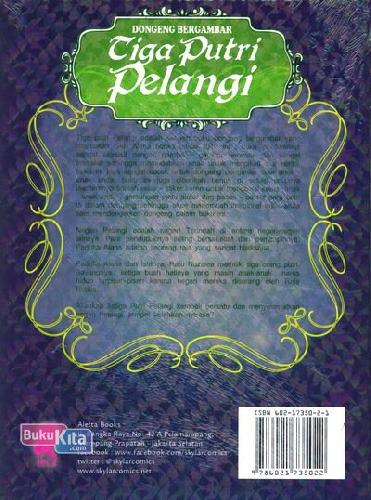 Tiga putri Pelangi adalah sebuah buku dongeng bergambar yang diterbitkan oleh Aletta books tahun 2013 ini , buku ini dikemas sangat ekslusif dengan gambar-gambar berwana dan sangat interaktif sehingga memudahkan anak untuk mengikuti alur cerita, buku ini juga sangat cocok untuk dongeng pengantar tidur anak-anak anda, buku ini juga diberikan bonus di setiap edisinya diantaranya adalah stiker-stiker keren untuk menghiasi kamar anak- anak anda, gantungan pintu pintar dan poster-poster para putri di dalam dongeng sehingga akan menambah imaginasi anak anda saat mendengarkan dongeng dalam buku ini.