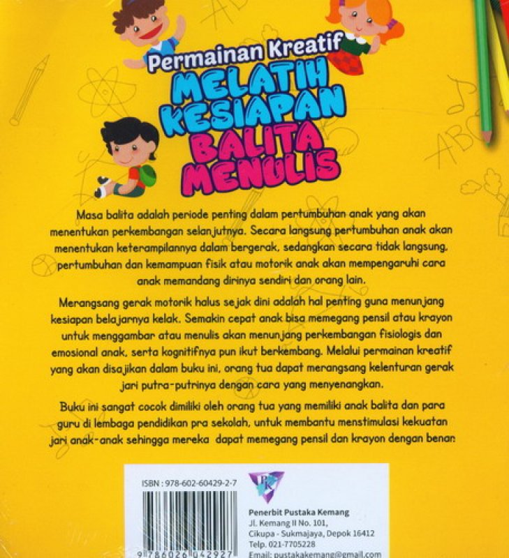 Merangsang gerak motorik halus sejak dini adalah hal penting guna menunjang kesiapan belajarnya kelak. Semakin cepat anak bisa memegang pensil atau krayon untuk menggambar atau menulis akan menunjang perkembangan fisiologis dan emosional anak, serta kognitifnya pun ikut berkembang. Melalui permainan kreatif yang akan disajikan dalam buku ini, orang tua dapat merangsang kelenturan gerak jari putra-putrinya dengan cara yang menyenangkan.