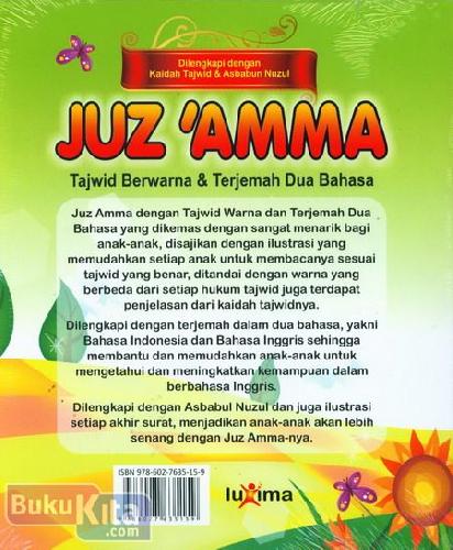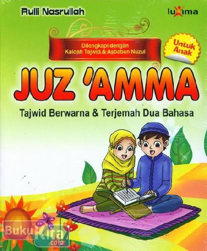 Juz Amma dengan Tajwid Warna dan Terjemah Dua Bahasa yang dikemas dengan sangat menarik bagi anak-anak, disajikan dengan ilustasi yang memudahkan setiap anak untuk membacanya sesuai tajwid yang benar, ditandai dengan warna yang berbeda dari setiap hukum tajwid juga terdapat penjelasan dari kaidah tajwidnya.