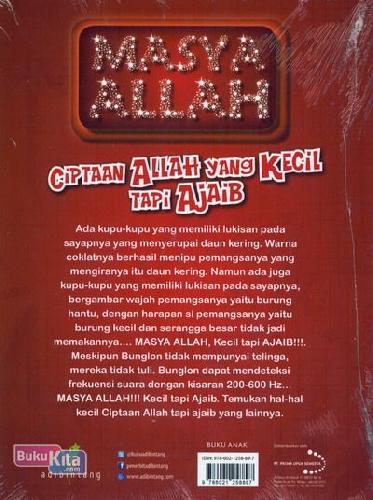 Ada kupu-kupu yang memiliki lukisan pada sayapnya yang menyerupai daun kering. Warna coklatnya berhasil menipu pemangsanya yang mengiranya itu daun kering. Namun ada juga kupu-kupu yang memiliki lukisan pada sayapnya, bergambar wajah pemangsanya yaitu burung hantu, dengan harapan si pemangsanya yaitu burung kecil dan serangga besar tidak jadi memakannya.... MASYA ALLAH, Kecil tapi AJAIB!!!. Meskipun Bunglon tidak mempunyai telinga, mereka tidak tuli. Bunglon dapat mendeteksi frekuensi suara dengan kisaran 200-600 Hz... MASYA ALLAH!!! Kecil tapi Ajaib. Temukan hal-hal kecil Ciptaan Allah tapi ajaib yang lainnya.