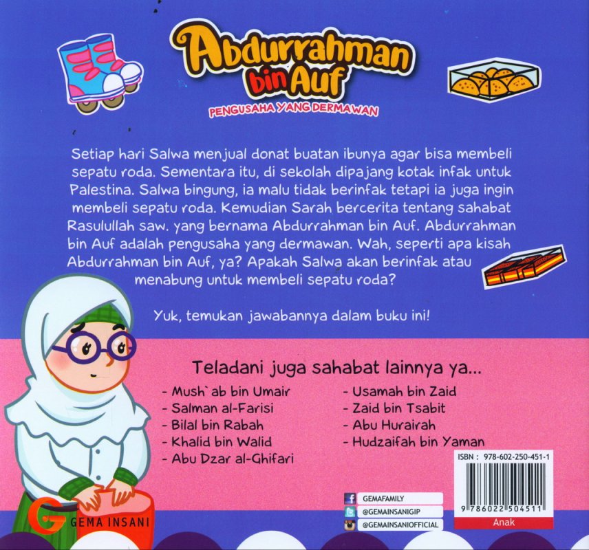 Setiap hari Salwa menjual donat buatan ibunya agar bisa membeli sepatu roda. Sementara itu, di sekolah dipajang kotak infak untuk Palestina. Salwa bingung, ia malu tidak berinfak tetapi ia juga ingin membeli sepatu roda. Kemudian Sarah bercerita tentang sahabat Rasulullah saw. yang bernama Abdurrahman bin Auf. Abdurrahman bin Auf adalah pengusaha yang dermawan. Wah, seperti apa kisah Abdurrahman bin Auf, ya? Apakah Salwa akan berinfak atau menabung untuk membeli sepatu roda?