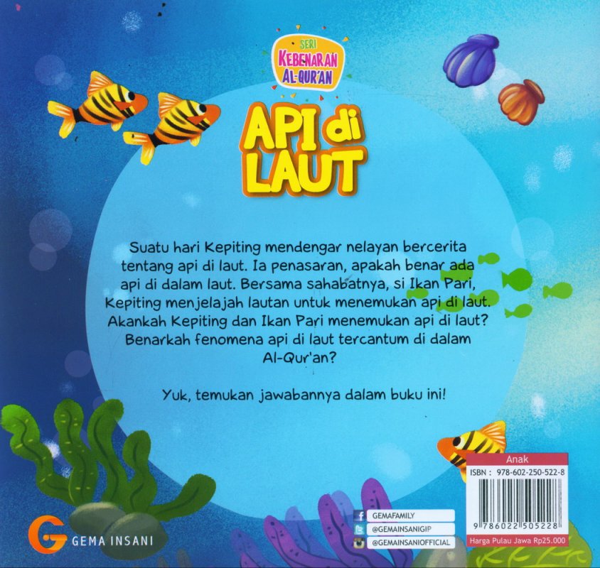 Suatu hari Kepiting mendengar nelayan bercerita tentang api di laut. Ia penasaran, apakah benar ada api di dalam laut. Bersama sahabatnya, si Ikan Pari, Kepiting menjelajah lautan untuk menemukan api di laut. Akankah Kepiting dan Ikan Pari menemukan api di laut? Benarkah fenomena api di laut tercantum di dalam Al-Qur'an?