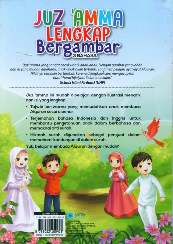 "Juz 'amma yang sangat cocok untuk anak-anak. Dengan gambar yang indah dan isi yang mudah dipahami, anak-anak akan terbantu saat mempelajari ayat-ayat Alquran. Nilainya semakin bertambah karena dilengkapi cara mengucapkan huruf-huruf hijaiyah. Selamat belajar."