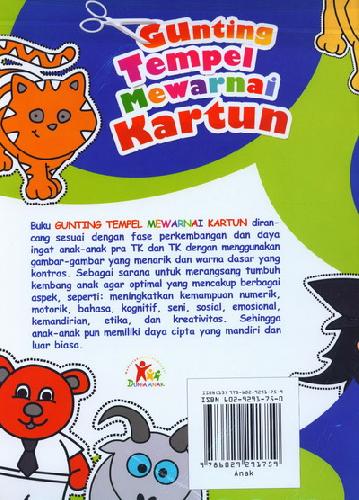 Buku GUNTING TEMPEL MEWARNAI KARTUN dirancang sesuai dengan fase perkembangan dan daya ingat anak-anak pra TK dan TK dengan menggunakan gambar-gambar yang menarik dan warna dasar yang kontras. Sebagai sarana untuk merangsang tumbuh kembang anak agar optimal yang mencakup berbagai aspek, seperti: meningkatkan kemampuan numerik, motorik, bahasa, kognitif, seni, sosial, emosional, kemandirian, etika, dan kreativitas. Sehingga anak-anak pun memiliki daya cipta yang mandiri dan luar biasa.