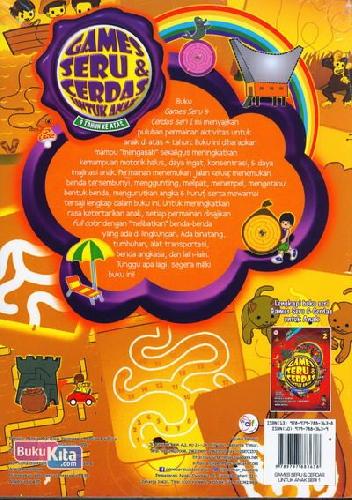 Buku Games Seru & Cerdas seri I ini menyajikan puluhan permainan aktivitas untuk anak di atas 4 tahun. Buku ini diharapkan mampu"mengasah" sekaligus meningkatkan kemampuan motorik halus, daya ingat, konsentrasi, & daya imajinasi anak. Permainan menemukan jala keluar, menemukan benda tersembunyi, menggunting, melipat, menempel, mengetahui bentuk benda, mengurutkan angka & huruf, serta mewarnai tersaji lengkap dalam buku ini. Untuk meningkatkan rasa ketertarikan anak, setiap permainan disajikan ful color dengan "melibatkan" benda-benda yang ada di lingkungan. Ada binatang, tumbuhan, alat transportasi, benda angkasa, dan lain-lain.