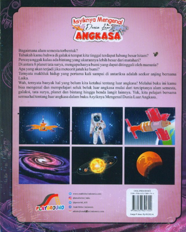 Ternyata makhluk hidup yang pertama kali sampai di antariksa adalah seekor anjing bernama Laika. Wah, ternyata banyak hal yang belum kita ketahui tentang luar angkasa! Melalui buku ini kamu bisa mengenal dan mempelajari seluk beluk luar angkasa mulai dari tcrciptanya alam semesta, galaksi, tata surya, planet dan bintang hingga benda langit lainnya. Yuk. kita pelajari bersama semua hal tentang luai angkasa dalam buku Asyiknya Mengenal Dunia Luar Angkasa.