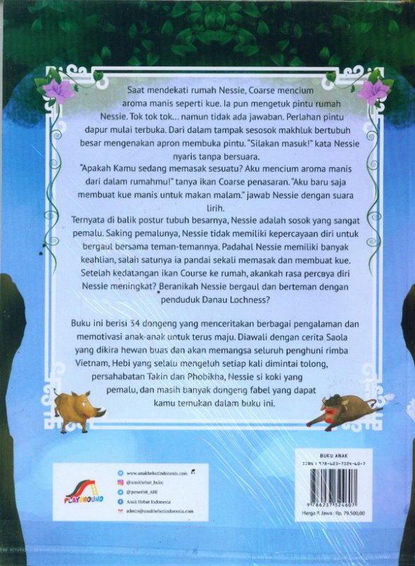 Saat mendekati rumah Nessie, Coarse mencium aroma manis seperti kue. la pun mengetuk pintu rumah Nessie. Tok tok tok... namun tidak ada jawaban. Perlahan pintu dapur mulai terbuka. Dari dalam tampak sesosok makhluk bertubuh besar mengenakan apron membuka pintu. "Silakan masuk!" kata Nessie nyaris tanpa bersuara. "Apakah Kamu sedang memasak sesuatu? Aku mencium aroma manis dari dalam rumahmu!" tanya ikan Coarse penasaran."Aku baru saja membuat kue manis untuk makan malam." jawab Nessie dengan suara lirih. Ternyata di balik postur tubuh besarnya, Nessie adalah sosok yang sangat pemalu. Saking pemalunya, Nessie tidak memiliki kepercayaan diri untuk bergaul bersama teman-temannya. Padahal Nessie memiliki banyak keahlian, salah satunya ia pandai sekali memasak dan membuat kue. Setelah kedatangan ikan Course ke rumah, akankah rasa percaya diri Nessie meningkat? ^Beranikah Nessie bergaul dan berteman dengan penduduk Danau Lochness? Buku ini berisi 54 dongeng yang menceritakan berbagai pengalaman dan memotivasi anak anak untuk terus maju. Diawali dengan cerita Saola yang dikira hewan buas dan akan memangsa seluruh penghuni rimba Vietnam, Hebi yang selalu mengeluh setiap kali dimintai tolong, persahabatan Takin dan Phobikha, Nessie si koki yang pemalu, dan masih banyak dongeng fabel yang dapat kamu temukan dalam buku ini.