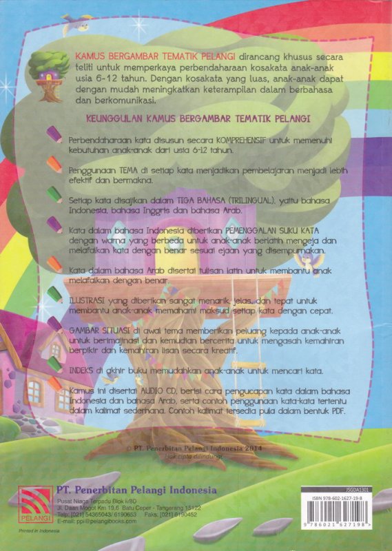 KAMUS BERGAMBAR TEMATIK PELANGI dirancang khusus secara teliti untuk memperkaya perbendaharaan kosakata anak-anak usia 6-12 tahun. Dengan kosakata yang luas, anak-anak dapat dengan mudah meningkatkan keterampilan dalam berbahasa dan berkomunikasi.