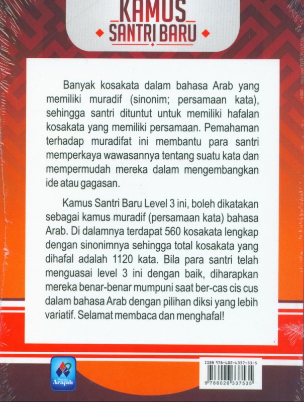 Kamus Santri Baru Level 3 ini, boleh dikatakan sebagai kamus muradif (persamaan kata) bahasa Arab. Di dalamnya terdapat 560 kosakata lengkap dengan sinonimnya sehingga total kosakata yang dihafal adalah 1120 kata. Bila para santri telah menguasai level 3 ini dengan baik, diharapkan mereka benar-benar mumpuni saat ber-cas cis cus dalam bahasa Arab dengan pilihan diksi yang lebih variatif. Selamat membaca dan menghafal!