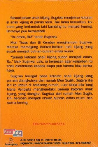 Sugriwa teringat pada kotoran anak kijang yang pernah diangkutnya dari rumah Men Sugih. Segera dia lari ke kebun di belakang rumah. Luar biasa bila Yang Maha Pencipta menghendaki! Semua kotoran anak kijang, yang diangkut Sugriwa dari rumah Men Sugih, kini berubah menjadi ribuan butiran emas murni berwarna kuning.