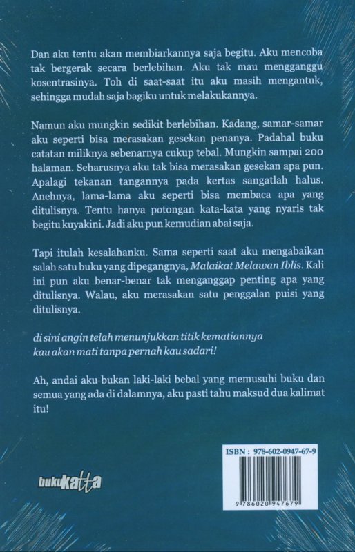 Tapi itulah kesalahanku. Sama seperti saat aku mengabaikan salah satu buku yang dipegangnya, Malaikat Melawan Iblis. Kali ini pun aku benar-benar tak menganggap penting apa yang ditulisnya. Walau, aku merasakan satu penggalan puisi yang ditulisnya.