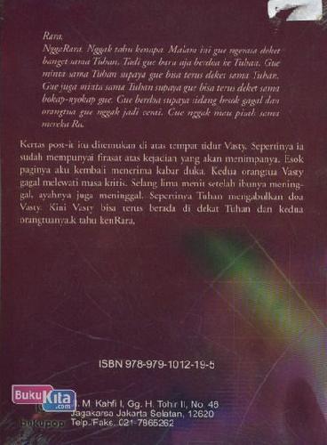 Ngga Rara. Nggak tahu kenapa. Malam ini gue ngerasa deket banget sama Tuhan. Tadi gue baru aja berdoa ke Tuhan. Gue minta sama Tuhan supaya gue bisa terus deket sama Tuhan. Gue juga minta sama Tuhan supaya gue bisa terus deket sama bokap-nyokap gue. Gue berdoa supaya sidang besok ggal dan orangtua gue nggak jadi cerai. Gue nggak mau pisah sama mereka Ra.