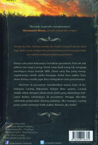 Petaka itu tiba. Sialnya petaka itu malah menjadi alasan kuat bagi Ayah untuk mengandangkanku ke pesantren supaya tidak liat seperti anak yang kurang perhatian. Hanya satu jalan keluarnya: masuk ke pesantren. Pun tak ada pilihan lain bagi Larang. Demi sang Ayah yang tak sanggup membayar biaya masuk SMA. Demi sang Ibu yang menginginkannya untuk selalu menjaga shalat lima waktu. Dan, demi dirinya sendiri agar bisa melupakan cinta pertamanya. Hari-hari di pesantren memberikan warna baru di kehidupan Larang. Bukannya belajar ilmu agama, Larang malah sibuk dengan ritual-ritual aneh yang dijalaninya bersama kedua sahabatnya di pesantren. Hingga tiba-tiba sebentuk penyesalan data padanya. Jika mampu, Larang pasti sudah memutar balik waktu. Namun, jika tidak?