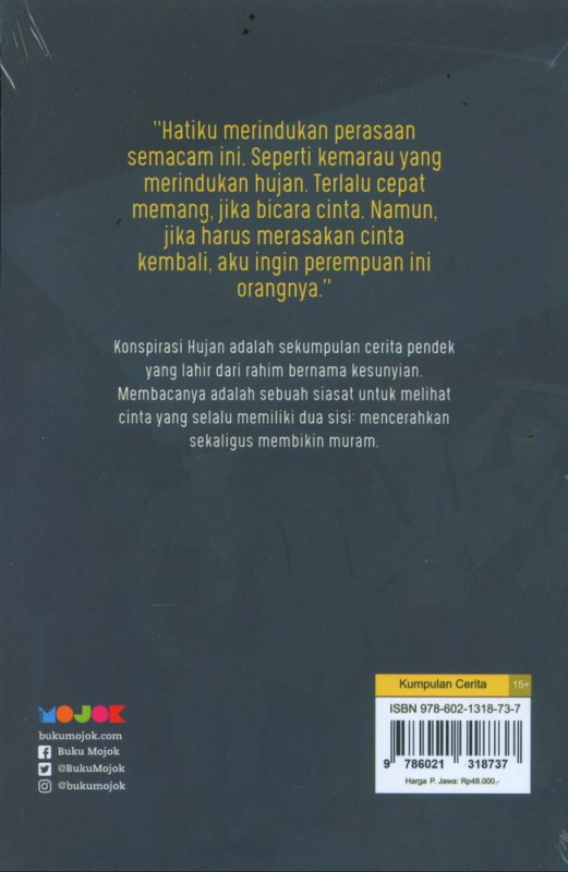 Konspirasi Hujan adalah sekumpulan cerita pendek yang lahir dari rahim bernama kesunyian. Membacanya adalah sebuah siasat untuk melihat cinta yang selalu memiliki dua sisi: mencerahkan sekaligus membikin muram.