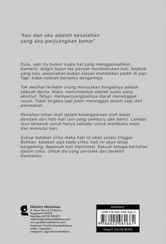 Dulu, sepi itu bukan suatu hal yang menggelisahkan. Kemarin, dingin hujan tak pernah membekukan hati. Sedetik yang lalu, perpisahan bukan alasan menitikkan pedih di pipi. Tapi, tidak setelah bertemu dengannya. Tak melihat terlebih urung merasakan hangatnya adalah sebuah derita. Maka, mencintainya adalah suatu yang absolut. Tetapi, memperjuangkannya ibarat menenggak racun. Tidak tergesa tapi pasti meranggas dalam sepi dan penolakan.