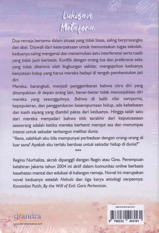 Regina Nurhaliza, akrab dipanggil dengan Regin atau Gina. Perempuan kelahiran Jakarta tahun 2004 ini aktif dalam komunitas online berbasis kesehatan mental dan edukasi di kalangan remaja. Novel ini merupakan novel keduanya setelah Nebula dan tiga karya antologi cerpennya: Konstelasi Putih; By the Wi11 of Evil; Garis Perhentian.