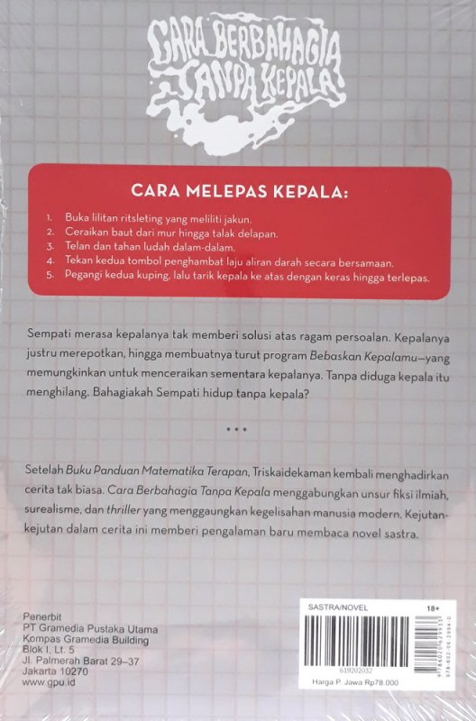 Setelah Buku Panduan Matematika Terapan, Triskaidekaman kembali menghadirkan cerita tak biasa. Cara Berbahagia Tanpa Kepala menggabungkan unsur fiksi ilmiah, surealisme, dan thriller yang menggaungkan kegelisahan manusia modern. Kejutan-kejutan dalam cerita ini memberi pengalaman baru membaca novel sastra.