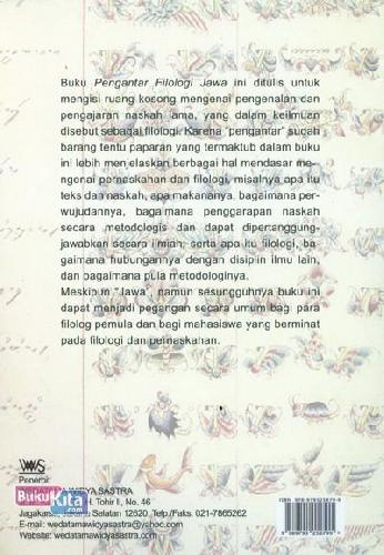 Buku Pengantar Filologi Jawa ini ditulis untuk mengisi ruang kosong mengenai pengenalan dan pengajaran naskah lama, yang dalam keilmuan disebut sebagai filologi. Karena "pengantar" sudah barang tentu paparan yang termaktub dalam buku ini lebih menjelaskan berbagai hal mendasar mengenai pernaskahan dan filologi, misalnya apa itu teks dan naskah, apa makananya, bagaimana perwujudannya, bagaimana penggarapan naskah secara metodologis dan dapat dipertanggungjawabkan secara ilmiah; serta apa itu filologi, bagaimana hubungannya dengan disiplin ilmu lain, dan bagaimana pula metodologinya.
