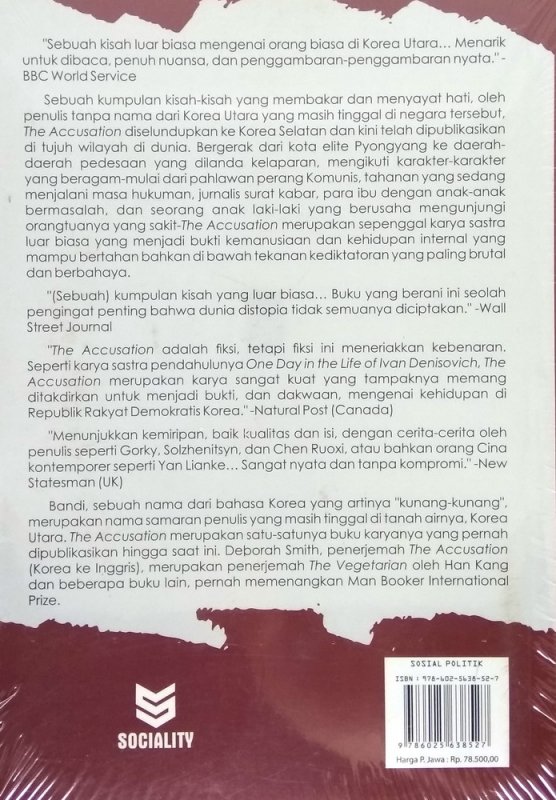 Sebuah kumpulan kisah-kisah yang membakar dan menyayat hati, oleh penulis tanpa nama dari Korea Utara yang masih tinggal di negara tersebut, The Accusation diselundupkan ke Korea Selatan dan kini telah dipublikasikan di tujuh wilayah di dunia. Bergerak dari kota elite Pyongyang ke daerah-daerah pedesaan yang dilanda kelaparan, mengikuti karakter-karakter yang beragam mulai dari pahlawan perang Komunis, tahanan yang sedang menjalani masa hukuman, jurnalis surat kabar, para ibu dengan anak-anak bermasalah, dan seorang anak laki-laki yang berusaha mengunjungi orangtuanya yang sakit- The Accusation merupakan sepenggal karya sastra luar biasa yang menjadi bukti kemanusiaan dan kehidupan internal yang mampu bertahan bahkan di bawah tekanan kediktatoran yang paling brutal dan berbahaya