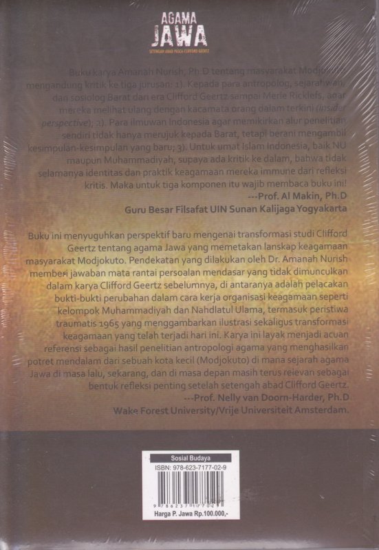 Buku ini menyuguhkan perspektif baru mengenai transformasi studi Chfford Geertz tentang agama Jawa yang memetakan lanskap keagamaan masyarakat Modjokuto. Pendekatan yang dilakukan oleh Dr. Amanah Nurish memberi jawaban mata rantai persoalan mendasar yang tidak dimunculkan dalam karya Clifford Geertz sebelumnya, di antaranya adalah pelacakan bukti-bukti perubahan dalam cara kerja organisasi keagamaan seperti kelompok Muhammadiyah dan Nahdlatul Ulama, termasuk peristiwa traumatis 1965 yang menggambarkan ilustrasi sekaligus transformasi keagamaan yang telah terjadi hari ini. Karya ini layak menjadi acuan referensi sebagai hasil penelitian antropologi agama yang menghasilkan potret mendalam dari sebuah kota kecil(modjokuto)dimana sejarah agama jawa dimasa lalu,sekarang,dan dimasa depan masih terus relevan sebagai bentuk refleksi penting setengah abad Clifford Geertz.