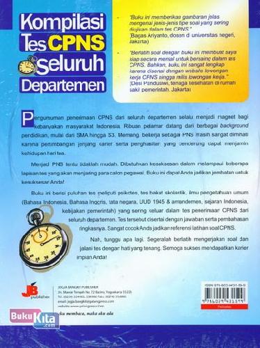 Buku ini berisi puluhan tes meliputi psikotes, tes bakat skolastik, ilmu pengetahuan umum (Bahasa Indonesia, Bahasa Inggris, tata negara, UUD 1945 & amandemen, sejarah Indonesia, kebijakan pemerintah) yang sering keluar dalam tes penerimaan CPNS dari seluruh departemen. Tes tersebut disertai dengan jawaban serta pembahasan ringkasnya. Sangat cocok Anda jadikan referensi latihan soal CPNS.