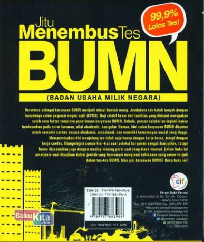Berstatus sebagai karyawan BUMN menjadi mimpi banyak orang. Jumlahnya tak kalah banyak dengan banyaknya calon pegawai negeri sipil (CPNS). Gaji relatif besar dan fasilitas yang didapat merupakan salah satu faktor ramainya penerimaan karyawan BUMN. Dahulu, proses seleksi seringkali hanya berdasarkan pada surat lamaran, nilai akademis, dan gelar. Namun, kini calon karyawan BUMN dituntut untuk semkin cerdas secara akademis, emosional, dan memiliki kematangan sosial yang tinggi. Mempersiapkan diri menjelang tes tidak saja hanya dengan kerja keras, tetapi degan kerja cerdas. Memperlajari semua kisi-kisi soal seleksi karyawan sangat dianjurkan, tetapi harus disesuaikan juga dengna masing-masing porsi soal yang biasa muncul. Dalam buku ini antarjenis soal disajikan dalam jumlah yang bervariasi mengikuti kebiasaan yang umum terjadi dalam tes-tes BUMN. Mau jadi karyawan BUMN? Baca buku ini.