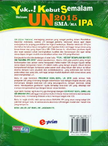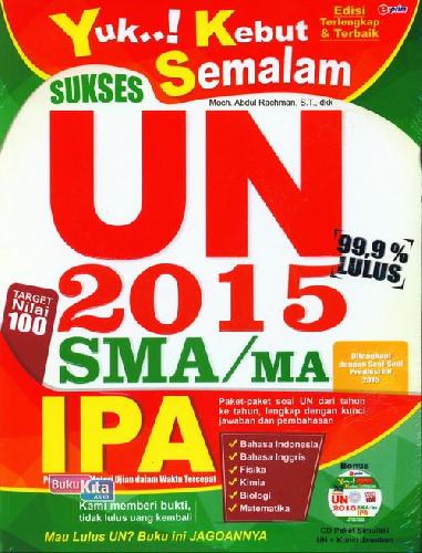 Menjawab kondisi dan tantangan di atas buku "YUK..! KEBUT SEMALAM SUKSES UN SMA/MA I PA 2015" adalah jawabannya, diramu oleh para praktisi yang sangat berkompeten dan paham serta menguasai materi-materi UN dengan tujuan setiap siswa dapat menguasai materi UN dalam waktu yang sangat singkat, dibuat secara komprehensif dengan komposisi paket-paket soal yang keluar dari tahun ke tahun disertai dengan kunci jawaban dan pembahasannya yang sistematis dan konkret pada setiap soal yang ada, sehingga sangat mudah dipahami oleh siswa-siswa yang akan menghadapi UN.