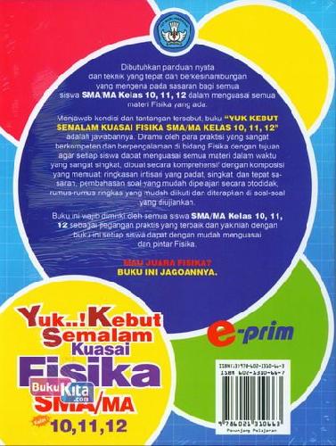 Menjawab kondisi dan tantangan tersebut, buku "YUK KEBUT SEMALAM KUASAI FISIKA SMA/MA KELAS 10, 11, 12" adalah jawabannya. Diramu oleh para praktisi yang sangat berkompeten dan berpengalaman di bidang Fisika dengan tujuan agar setiap siswa dapat menguasai semua materi dalam waktu yang sangat singkat, dibuat secara komprehensif dengan komposisi yang memuat: ringkasan intisari yang padat, singkat, dan tepat sasaran, pembahasan soal yang mudah dipelajari secara otodidak, rumus-rumus ringkas yang mudah diikuti dan diterapkan di soal-soal yang diujiankan.
