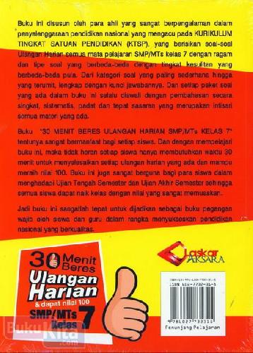 Buku "30 MENIT BERES ULANGAN HARIAN SMP/MTs KELAS 7' tentunya sangat bermanfaat bagi setiap siswa. Dan dengan mempelajari buku ini, maka tidak heran setiap siswa hanya membutuhkan waktu 30 menit untuk menyelesaikan setiap ulangan harian yang ada dan mampu meraih nilai 100. Buku ini juga sangat berguna bagi para siswa dalam menghadapi Ujian Tengah Semester dan Ujian Akhir Semester sehingga semua siswa dapat naik kelas dengan nilai yang sangat memuaskan.