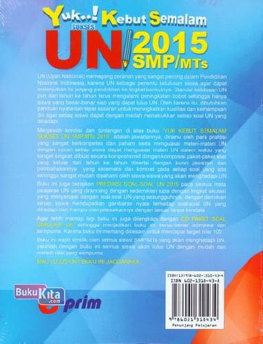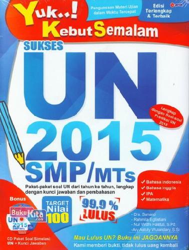 Menjawab kondisi dan tantangan di atas buku "YUK KEBUT SEMALAM SUKSES UN SMP/MTs 2015 adalah jawabannya, diramu oleh para praktisi yang sangat berkompeten dan paham serta menguasai materi-materi UN dengan tujuan setiap siswa dapat menguasai materi UN dalam waktu yang sangat singkat, dibuat secara komprehensif dengan komposisi paket-paket soal yang keluar dari tahun ke tahun disertai dengan kunci jawaban dan pembahasannya yang sistematis dan konkret pada setiap soal yang ada sehingga sangat mudah dipahami oleh siswa-siswa yang akan menghadapi UN