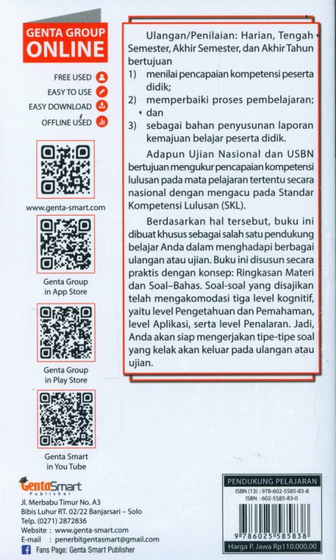 Berdasarkan hal tersebut, buku ini dibuat khusus sebagai salah satu pendukung belajar Anda dalam menghadapi berbagai ulangan atau ujian. Buku ini disusun secara praktis dengan konsep: Ringkasan Materi dan Soal-Bahas. Soal-soal yang disajikan telah mengakomodasi tiga level kognitif, yaitu level Pengetahuan dan Pemahaman, level Aplikasi, serta level Penalaran. Jadi, Anda akan siap mengerjakan tipe-tipe soal yang kelak akan keluar pada ulangan atau ujian.