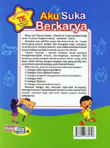 Buku seri Taman Kanak-Kanak ini di peruntukkan bagi anak TK untuk Tingkat A dan B, semester 1 dan 2. Kegiatan dan aktifitas yang ada dalam buku ini, sangat menunjang proses belajar dan mengajar bagi, orangtua, anak dan guru. Dengan buku ini, anak dapat memaksimalkan proses belajarnya baik di rumah maupun di sekolah.