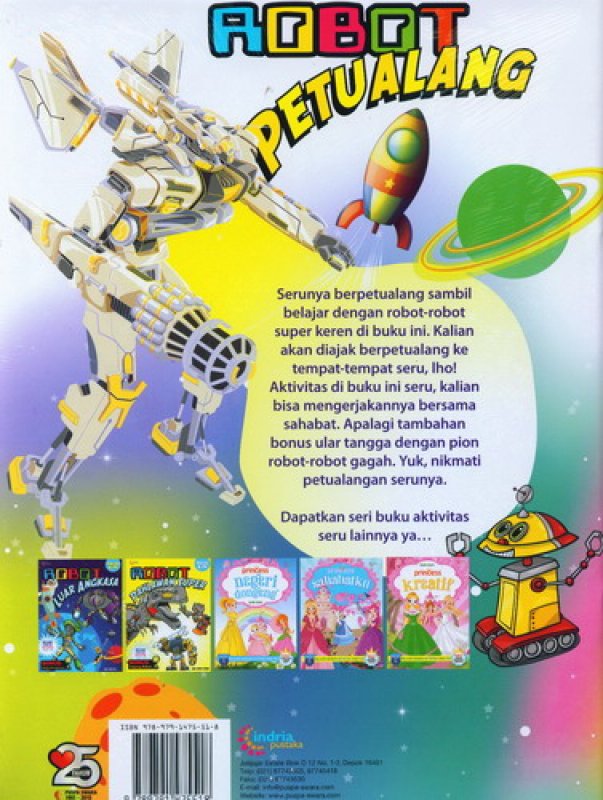 Serunya berpetualang sambil belajar dengan robot-robot super keren di buku ini. Kalian akan diajak berpetualang ke tempat-tempat seru, lho! Aktivitas di buku ini seru, kalian bisa mengerjakannya bersama sahabat. Apalagi tambahan bonus ular tangga dengan pion robot-robot gagah. Yuk, nikmati petualangan serunya.