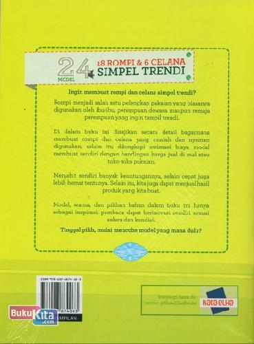 Menjahit sendiri banyak keuntungannya, selain cepat juga lebih hemat tentunya. Selain itu, kita juga dapat menjual hasil produk yang kita buat. Model, warna, dan pilihan bahan dalam buku ini hanya sebagai inspirasi, pembaca dapat berinovasi sendiri sesuai selera dan kondisi.