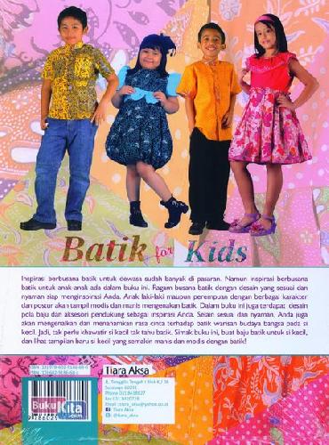 Inspirasi berbusana batik untuk dewasa sudah banyak di pasaran. Namun inspirasi berbusana batik untuk anak-anak ada dalam buku ini. Ragam busana batik dengan desain yang seusai dan nyaman siap menginspirasi Anda. Anak laki-laki maupun permepuan dengan berbagai karakter dan postur akan tampil modis dan manis mengenakan batik. Dalam buku ini juga terdapat desain pola baju dan aksesori pendukung sebagai inspirasi anda. Selain sesuai dan nyaman, Anda juga akan mengenalkan dan menanamkan rasa cinta terhadap batik warisan budaya bangsa pada si kecil. Jadi, tak perlu khawatir si kecil tak tahu batik. Simak buku ini, buat baju batik untuk si kecil, dan lihat tampilan baru si kecil yang semakin manis dan modis dengan batik.
