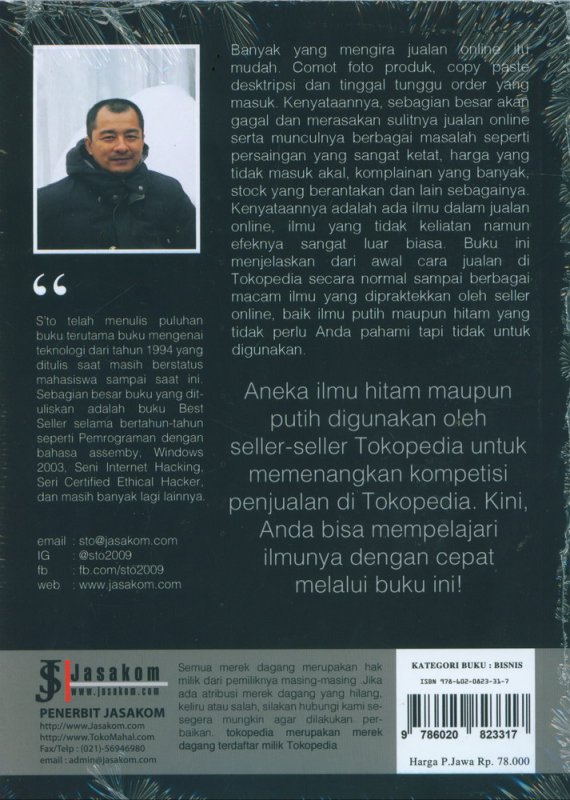 Banyak yang mengira jualan online itu mudah. Comot foto produk, copy paste desktripsi dan tinggal tunggu order yang masuk. Kenyataannya, sebagian besar akan gagal dan merasakan sulitnya jualan online serta munculnya berbagai masalah seperti persaingan yang sangat ketat, harga yang tidak masuk akal, komplainan yang banyak, stock yang berantakan dan lain sebagainya. Kenyataannya adalah ada ilmu dalam jualan online, ilmu yang tidak keliatan namun efeknya sangat luar biasa. Buku ini menjelaskan dari awal cara jualan di Tokopedia secara normal sampai berbagai macam ilmu yang dipraktekkan oleh seller online, baik ilmu putih maupun hitam yang tidak perlu Anda pahami tapi tidak untuk digunakan.