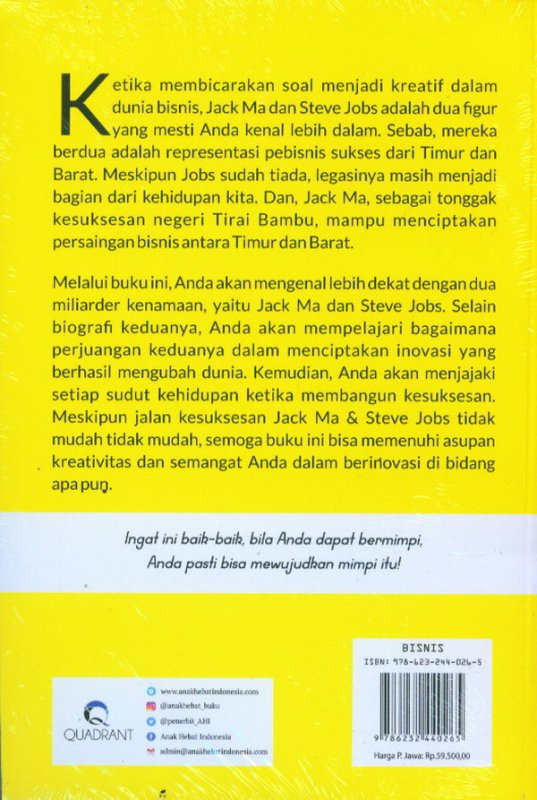 persaingan bisnisantaraTimur dan Barat. Melalui buku ini, Anda akan mengenal lebihdekat dengan dua miliarder kenamaan, yaitu Jack Ma dan Steve Jobs. Selain biografi keduanya, Anda akan mempelajari bagaimana perjuangan keduanya dalam menciptakan inovasi yang berhasil mengubah dunia. Kemudian, Anda akan menjajaki setiap sudut kehidupan ketika membangun kesuksesan. Meskipun jalan kesuksesan Jack Ma & Steve Jobs tidak