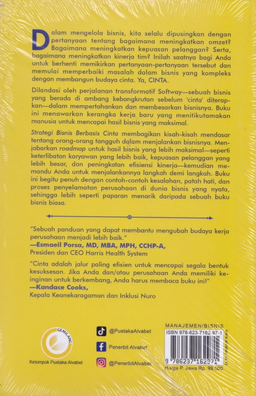 Strategi Bisnis Berbasis Cinta membagikan kisah-kisah mendasar tentang orang-orang tangguh dalam menjalankan bisnisnya. Menjabarkan roadmap untuk hasil bisnis yang lebih maksimalseperti keterlibatan karyawan yang lebih baik, kepuasan pelanggan yang lebih besar, dan peningkatan efisiensi kinerjakemudian memandu Anda untuk menjalankannya langkah demi langkah. Buku ini begitu penuh dengan contoh-contoh kesalahan, patah hati, dan proses penyelamatan perusahaan di dunia bisnis yang nyata, sehingga lebih seperti paparan menarik daripada sebuah buku bisnis biasa.