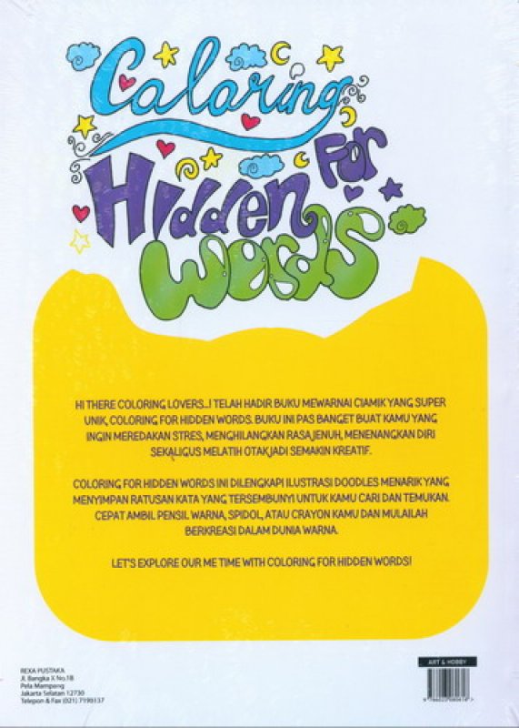 HI THERE COLORING; LOVERS.! TELAH HADIR BUKU MEWARNAI CIAMIK YANG SUPER UNIK, COLORING FOR HIDDEN WORDS. BUKU INI PAS BANGET BUAT KAMU YANG INGIN MEREDAKAN STRES, MENGHILANGKAN RASA JENUH, MENENANGKAN DIRI SEKALIGUS MELATIH OTAK JADI SEMAKIN KREATIF.