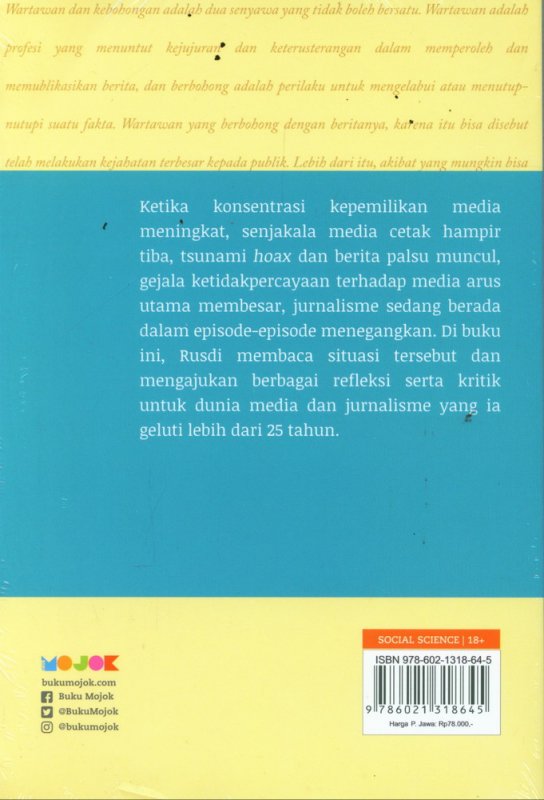 Ketika konsentrasi kepemilikan media meningkat, senjakala media cetak hampir tiba, tsunami hoax dan berita palsu muncul, gejala ketidakpercayaan terhadap media arus utama membesar, jurnalisme sedang berada dalam episode-episode menegangkan. Di buku ini, Rusdi membaca situasi tersebut dan mengajukan berbagai refleksi serta kritik untuk dunia media dan jurnalisme yang ia geluti lebih dari 25 tahun.
